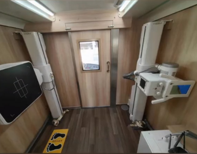 有時(shí)候胸口不舒服,腰不好怎么辦呢?車載DR可以實(shí)現(xiàn)就地檢查,不需要到醫(yī)院拍胸片進(jìn)行DR超聲檢查。大家能在醫(yī)院完成的體檢項(xiàng)目,都可以實(shí)現(xiàn)。醫(yī)生通過外面的電腦,打開和控制設(shè)備。DR會(huì)根據(jù)檢查者的身高體型,自動(dòng)判斷位置移動(dòng)到檢查的區(qū)域。自動(dòng)成像,并且在服務(wù)器里面記錄相應(yīng)的數(shù)據(jù)。效率也非常高,當(dāng)天檢查就能當(dāng)天出結(jié)果。可以滿足突發(fā)事件中傷病員的頸椎、胸椎、腰椎、四肢骨骼、胸部、骨盆、各個(gè)關(guān)節(jié)全身的數(shù)字化DR檢查需求。