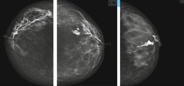 乳腺導管內乳頭狀瘤分為以下兩個,位于乳暈區大導管的中央型乳頭狀瘤,起源于末梢導管小葉單位的外周型乳頭狀瘤。外周型乳頭狀瘤常常沒有明顯的的臨床表現,常因X線或乳腺超聲設備檢查發現。重點要關注的是中央型乳頭狀瘤,發生于任何年齡的女性,以40~50歲者居多。它表現為:單側乳頭溢液,特別是血性溢液少數病人可在乳暈區觸及腫塊。從病理學上面講表現為導管上皮和間質增生形成有纖維脈管束的乳頭狀結構。這是它一個病理學上的表現。它的超聲表現為:病變導管囊狀擴張呈無回聲,內可見乳頭狀低回聲或中等回聲。乳暈處的導管擴張,管腔內可見邊界清楚的,低回聲實性結節。外周型導管內乳頭狀瘤可,表現擴張為為低回聲的實性結節,CDFI:部分腫瘤可顯示為軸心性的看到血流信號。乳腺增生癥:可見導管擴張,內無乳頭狀實性回聲,導管內乳頭狀癌:囊內乳頭狀癌病變較大,不規則,厚基底,血流豐富。以囊性為主的混合回聲,形態不規則,內見實性低回聲實性低回聲可見少量血流,病理為囊內乳頭狀癌。