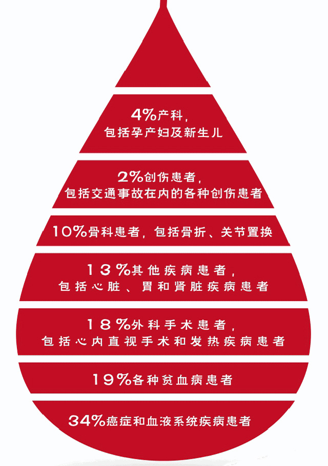 也就是大家獻的血經過分離檢驗存儲后送到各大醫療機構用來對有需要輸血的病人輸血救治。其實我們很多人有個認識誤區,以為血液就是在災難時候才需要獻血,其實醫院每天有不少病人需要各種血液成分來搶救治療。大量失血的病人,外傷大出血,大型手術跟其他原因低血量,輸血來補充血液,血液大部分用于癌癥跟血液疾病的病人。慢性失血、紅細胞被破壞或白蛋白合成不足。如血友病、血小板減少癥或血小板功能障礙。凝血異常導致失血,具體來講血液有個使用比例數據。有助于挽救生命延長生命提高生活質量。