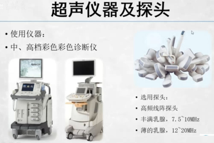 那么使用的設(shè)備呢要求是中高檔的彩色診斷儀。探頭型號(hào)非常的豐富,針對(duì)不同的器官采用不同的探頭。檢查乳腺使用高頻線陣探頭,穿透力分辨率,豐滿乳腺,采用7.5~10MHz探頭,薄的乳腺乳腺小的患者,采用12~20MHz探頭。乳腺的掃查方法有兩種,看個(gè)人的習(xí)慣,一是從上到下,左到右,移動(dòng)探頭逐一切面掃描探頭不要跳躍。采用聯(lián)網(wǎng)式,二是順時(shí)針或者逆時(shí)針方向,由乳頭為中心輻射狀掃描檢查。乳頭向外掃查,乳頭向內(nèi)掃查都可以。最重要的也是探頭不要跳躍,一定要采用聯(lián)網(wǎng)式的檢查。采用哪種方法,按照習(xí)慣選擇。乳腺的掃查的范圍有外向內(nèi)向外線內(nèi)線,乳頭中央?yún)^(qū)、向外延伸的腋尾區(qū)、腋窩、淋巴結(jié)四個(gè)象限。疊瓦式,剪草機(jī)式不放過任何位置。正常乳腺超聲標(biāo)準(zhǔn)斷面,經(jīng)乳腺腺體最厚處、通常于外上象限取得,在此段面測(cè)量乳腺厚度。